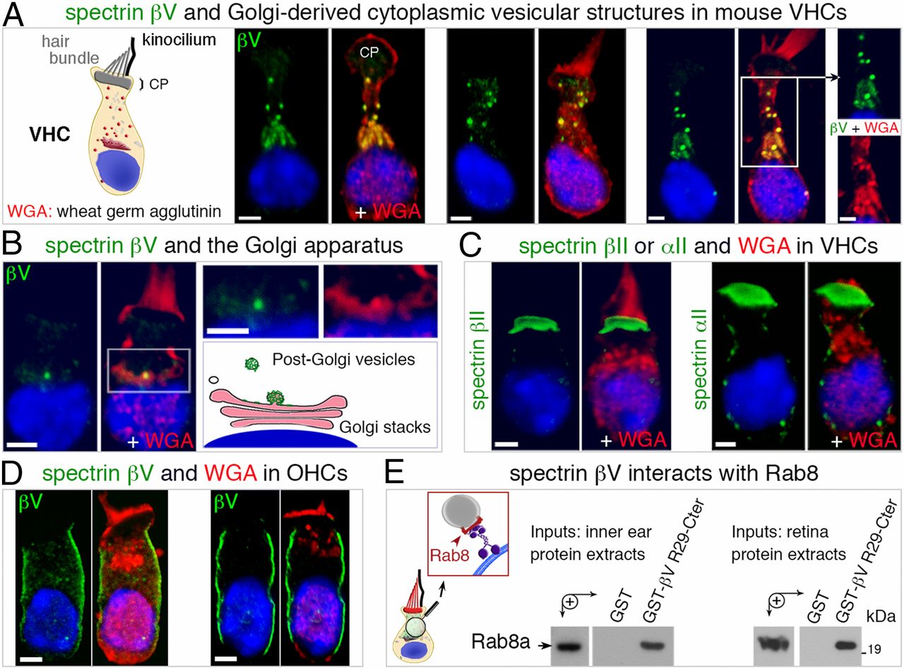 Spectrin βV associates with post-Golgi structures and binds to the Rab8 GTPase. (A) In mouse isolated vestibular hair cells (VHCs) on P10, the staining with TRITC-tagged wheat germ agglutinin (WGA) substantially overlaps with the spectrin βV immunostaining, both in the Golgi apparatus and in scattered post-Golgi secretory vesicles. (B) Focus on a spectrin βV-immunoreactive and TRITC-WGA-stained spot in the Golgi apparatus. (C) The TRITC-WGAâstained structures (red) are not colocated with spectrin αII- and spectrin βII-immunoreactive structures (green). (D) Unlike in VHCs, spectrin βV in mouse cochlear outer hair cells (OHCs) does not colocalize with TRITC-WGAâstained structures. (E) Spectrin βV binds to Rab8, a small GTPase involved in vesicular trafficking toward the plasma membrane. A GST-tagged R29-Cter fragment of spectrin βV (GST-βV R29-Cter), but not GST alone, binds to Rab8 present in protein extracts from the mouse inner ear or retina. Bars, 2 µm. |