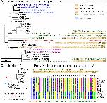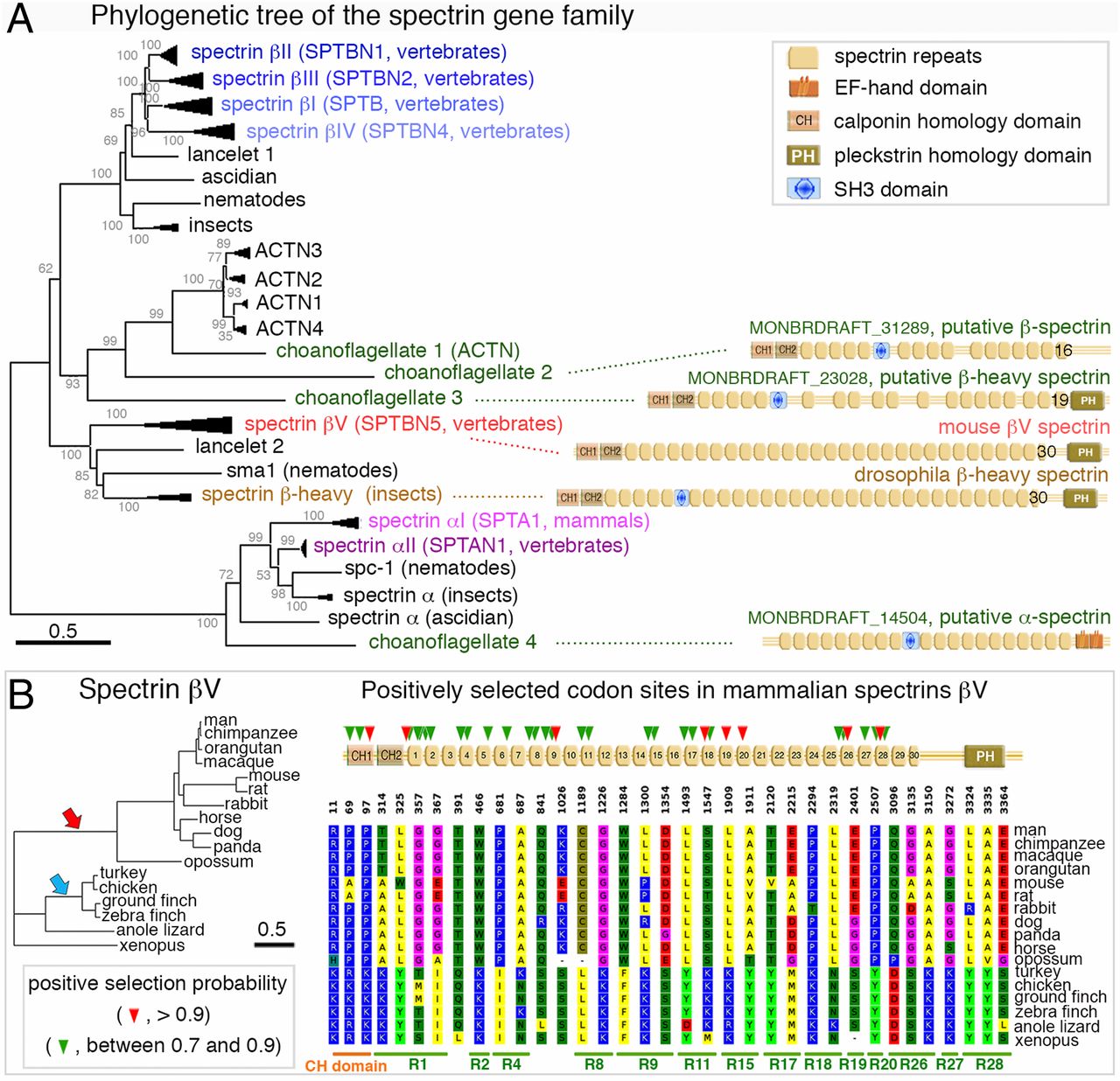 Spectrin family tree and signatures of positive selection in the amino acid sequences of mammalian spectrins βV. (A) Neighbor-joining phylogenetic tree of the complete spectrin gene family based on a multiple full-length sequence alignment from vertebrate and invertebrate species (Jones–Taylor–Thornton amino acid substitution model). Vertebrate spectrin branches were collapsed for the sake of clarity (see detailed tree in SI Appendix, Fig. S7). Predicted domains of the spectrins identified in the choanoflagellate Monosiga brevicollis are shown on the right side of the corresponding tree branches: MONBRDRAFT_14504, _31289, and _23028 refer to the putative α, β, and β-heavy (βH) spectrins, respectively. The nonconventional β spectrins of Drosophila (β-heavy) and mouse (βV) are shown for comparison. Bar, 0.5 substitution per site. (B) Diagram showing the positions of the amino acid residues submitted to positive selection in the mammalian lineage for spectrin βV (35 codon sites). Corresponding positions in the different vertebrate species are shown, with upper numbers indicating the positions in the human protein sequence. The protein domains are indicated below by horizontal bars. The phylogenetic tree of this spectrin is shown on the left side (the red and blue arrows indicate the mammalian and avian focal branches, respectively). Bar, 0.5 substitution per site. The detailed results of the phylogenic molecular analysis are presented in SI Appendix, Table S2. CH, calponin homology domain; Rn, spectrin repeat number n; PH, pleckstrin homology domain. |