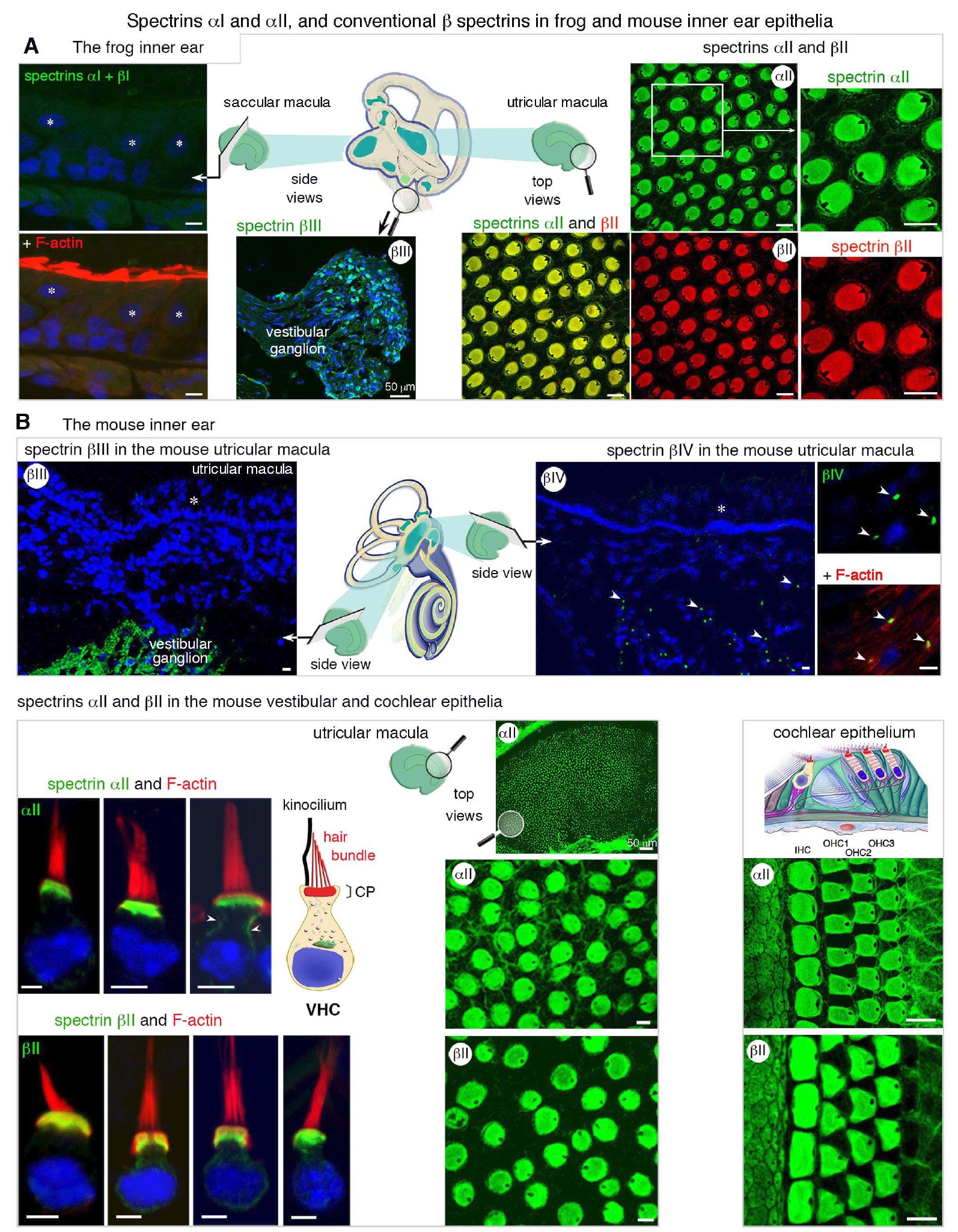utricular macula. Among conventional spectrins, only spectrins αII (green) and βII (red) are present