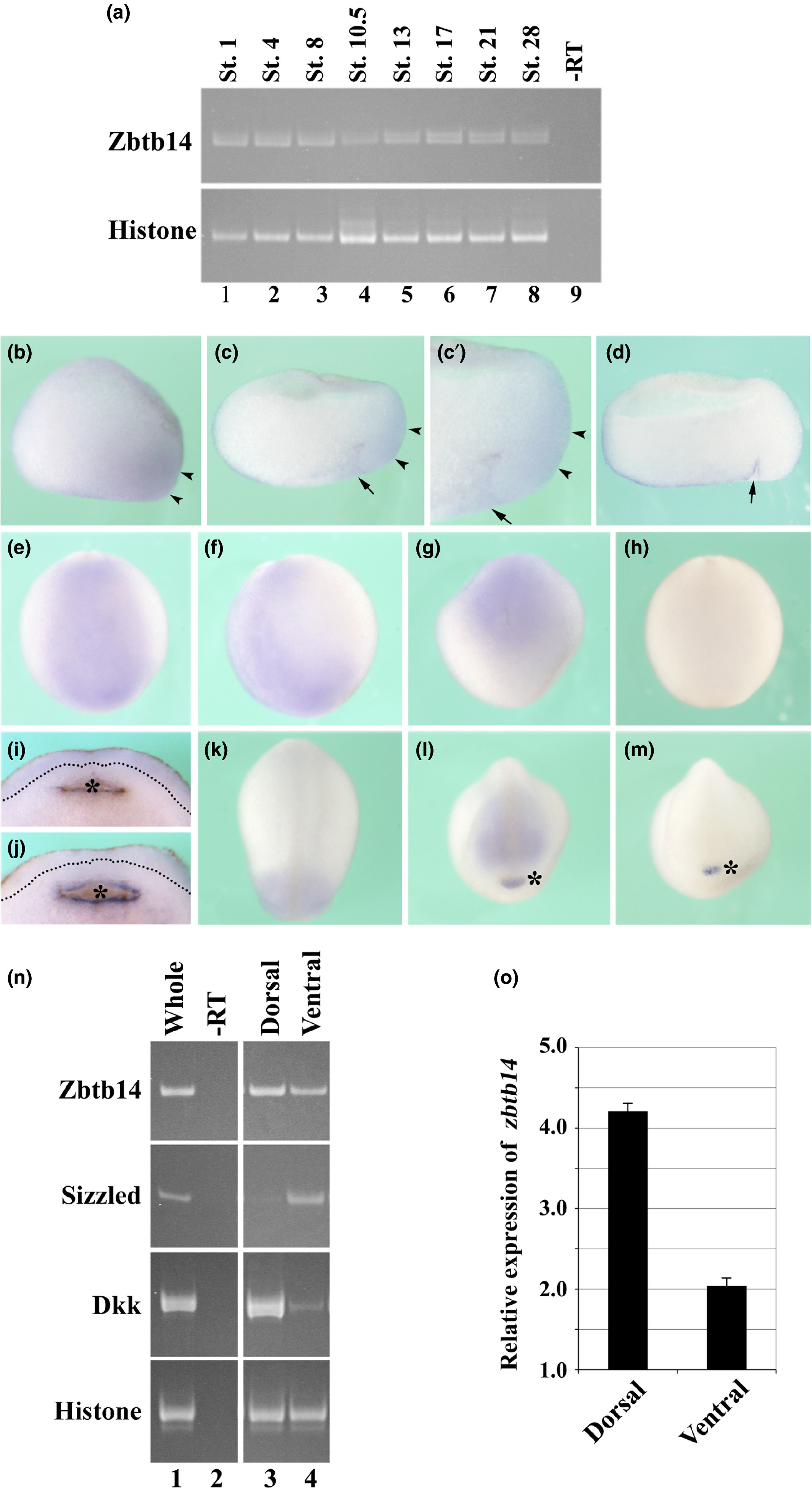 FIGURE 2âExpression patterns of zbtb14 during early Xenopus embryogenesis. (a) Temporal expression profile of zbtb14 analyzed by semi- quantitative RT- PCR during X. laevis embryogenesis. âRT indicates whole- embryo RNA (stage 1) processed in the absence of reverse transcriptase. histone H4 was used as a loading control. (bâm) Expression pattern of zbtb14 analyzed by whole- mount in situ hybridization during the early development of X. tropicalis. Expression of zbtb14 is observed in the dorsal region (arrowheads) at the early gastrula stage (b, c and câ). Sagittal half embryos cut through the blastopore region (arrows) at the gastrula stage are shown in (c) and (d). (câ) indicates a magnified view of (c). Significant expression of zbtb14 is observed in the neural plate at early neurula stages (eâg). Cross- sections of early neurula- stage embryos (i and j), showing localized expression of zbtb14 mainly in the ectoderm (i). At late neurula stages, expression of zbtb14 is detected in the neural tube and eye region (k and l), and expression is stronger in the anterior than in the posterior region. In (d), (h), (j) and (m), hybridization with a sense probe did not show significant signals in these regions, except for non- specific staining (shown as asterisks in i, j, l, and m). Images in (b), (c), and (d) show lateral side views of gastrula- stage embryos with the dorsal lip (arrows) to the right. Images in (e), (h), and (k) show dorsal side views of embryos with posterior to the top. (f) shows the lateral side view of the embryo in (e) with posterior to the top and dorsal to the left. (g) shows the posterior side view of the embryo in (e) with dorsal to the top. Images in (l) and (m) show the frontal view with dorsal to the top. The dotted line in each panel of (i) and (j) indicates the boundary between the ectoderm and mesoderm. (n and o) X. tropicalis gastrula embryos dissected into dorsal and ventral halves were analyzed by both semi- quantitative RT- PCR (n) and qPCR (o). zbtb14 was predominantly expressed in the dorsal region at the early gastrula stage. |