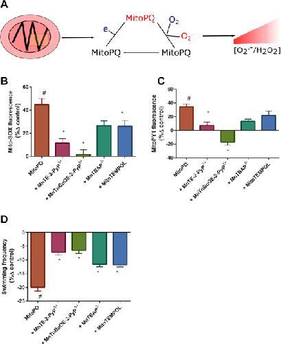 Fig. 4. MitoPQ induced motor deficits are redox regulated. (A) MitoPQ mechanism of action scheme. Within the mitochondrial matrix, MitoPQ accepts an electron from complex I to yield a MitoPQ radical. The MitoPQ radical reacts with molecular oxygen (O2) to generate O2.-, leading to an increase in matrix [O2.- and H2O2] (the latter as a consequence of MnSOD mediated O2.- dismutation). (B) Mito-SOX oxidation (expressed as %δ control) by condition (MitoPQ, MitoPQ plus: MnTE-2-PyP5+, MnTnBuOE-2-PyP5+, MnTBAP3- or MitoTempol n = 10 per condition). (C) MitoPY1 oxidation (expressed as %δ control) by condition (n = 10 per condition). (D) Evoked swimming frequency (expressed as %δ control) by condition (n = 10 in each condition). Error bars are SEM. Concentrations and incubations: MitoPQ (5 µM for 60 min), MnTE-2-PyP5+, MnTnBuOE-2-PyP5+, MnTBAP3- conditions = 1 µM for 30 min. MitoTempol = 20 µM for 30 min. #denotes significant difference vs control. *denotes significant difference vs MitoPQ. |