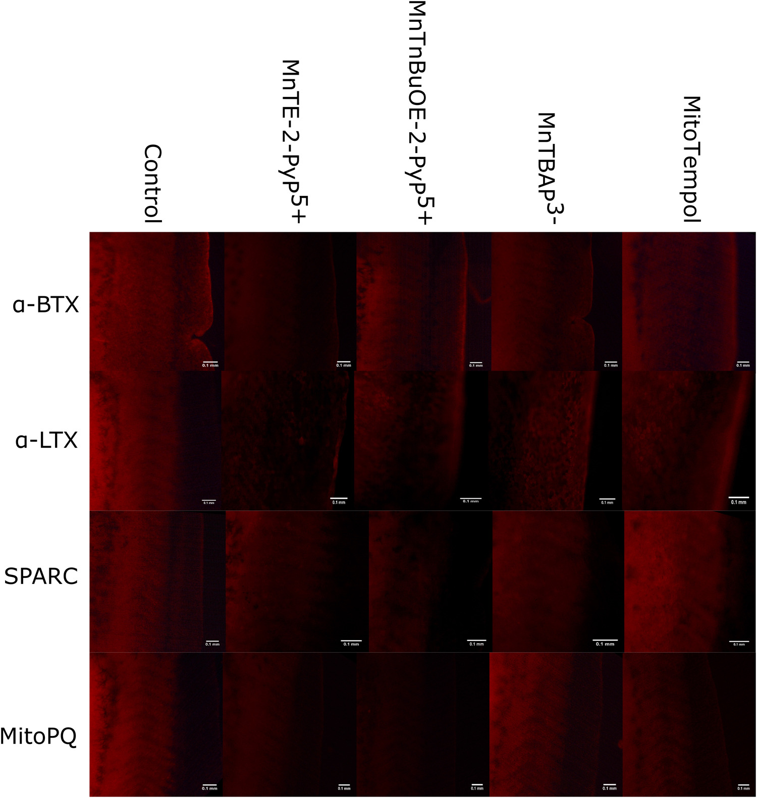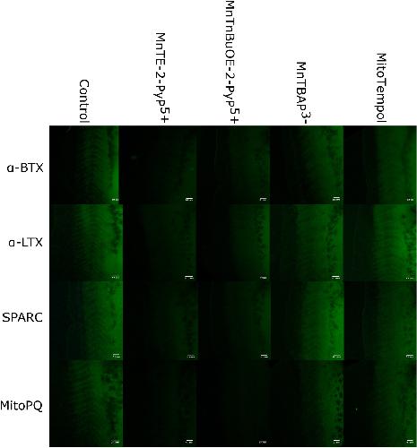 Supplementary Fig. 2. Representative florescent images of Mito-SOX oxidation in vivo by synaptic inactivity model (α-BTX, α-LTX, SPARC and MitoPQ) and treatment condition (control, MnTE-2-PyP5+, MnTnBuOE-2-PyP5+, MnTBAP3- and Mito-Tempol) taken from the intermyotomal region of stage 37–38 X. laevis tadpoles using whole-mount redox imaging. Scale bar is 0.1 mm. |