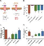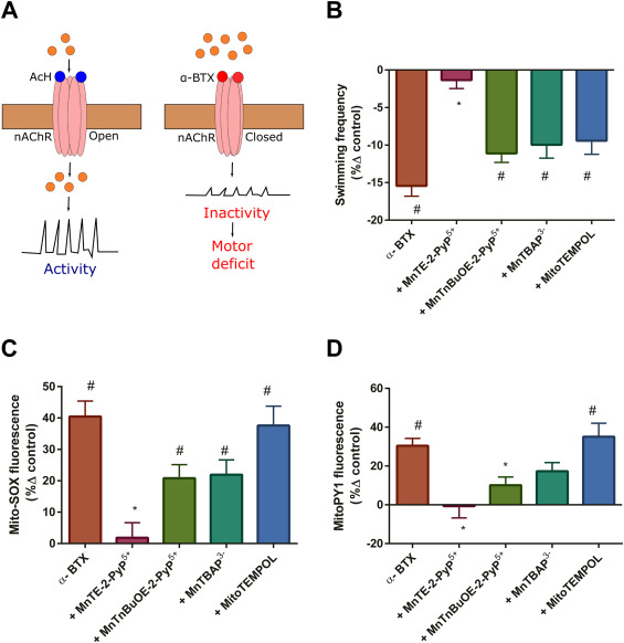 Fig. 1. α-BTX induced motor deficits are redox regulated. (A) α-BTX mechanism of action scheme. Left: skeletal muscle activity stems from acetylcholine (ACh) binding to post-synaptic nicotinic acetylcholine receptor (nAChR) to permit Na+ entry. Right: α-BTX ligates the nAChR to render it impermeable to Na+ leading to forced post-synaptic inactivity induced motor deficits. (B) Evoked swimming frequency (expressed as %δ control) by condition (α-BTX, α-BTX plus: MnTE-2-PyP5+, MnTnBuOE-2-PyP5+, MnTBAP3- or MitoTempol; n = 10 in each condition). (C) Mito-SOX oxidation (expressed as %δ control) by condition (n = 10 per condition). (D) MitoPY1 oxidation (expressed as %δ control) by condition (n = 10 per condition). Error bars are SEM. Concentrations and incubations: α-BTX (8 µM for 30 min), MnTE-2-PyP5+, MnTnBuOE-2-PyP5+, MnTBAP3- conditions = 1 µM for 30 min. MitoTempol = 20 µM for 30 min. # denotes significant difference vs control. * denotes significant difference vs α-BTX. |