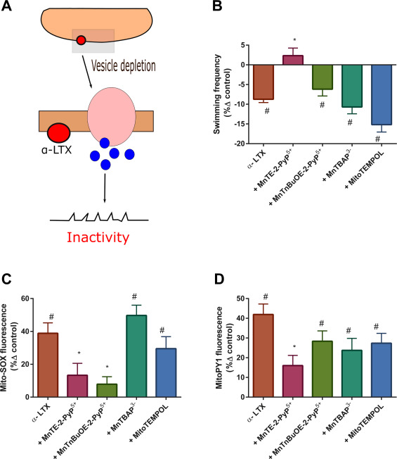 Fig. 2. α-LTX induced motor deficits are redox regulated. (A) α-LTX mechanism of action scheme. α-LTX binds to nerve terminals to cause mass neurotransmitter vesicle depletion, leading to pre-synaptic inactivity. (B) Evoked swimming frequency (expressed as %δ control) by condition (α-LTX, α-LTX plus: MnTE-2-PyP5+, MnTnBuOE-2-PyP5+, MnTBAP3- or MitoTempol; n = 10 in each condition). (C) Mito-SOX oxidation (expressed as %δ control) by condition (n = 10 per condition). (D) MitoPY1 oxidation (expressed as %δ control) by condition (n = 10 per condition). Error bars are SEM. Concentrations and incubations: α-LTX (15 nM for 30 min), MnTE-2-PyP5+, MnTnBuOE-2-PyP5+, MnTBAP3- conditions = 1 µM for 30 min. MitoTempol = 20 µM for 30 min. # denotes significant difference vs control. * denotes significant difference vs α-LTX. |