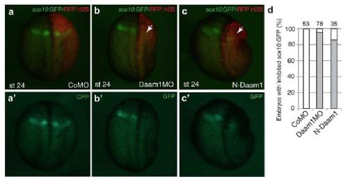 FIGURE 5 Sox10:GFP activation is prevented by N-Daam1 and Daam1 MO. aâc, Embryos were unilaterally injected with control MO (40ng, a), Daam1 MO (40 ng, b) or with N-Daam1 RNA (3 ng , c) as indicated. RFP-H2B RNA is a lineage tracer (1 00 pg, red). Dorsal views are shown, anterior is to the top. Arrows in b and c point to lack of reporter activation on the injected side. d, Frequencies of embryos with inhibited sox10:GFP expression. The number of embryos analyzed is indicated on top of each bar. |