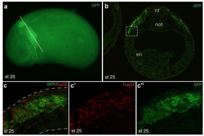 FIGURE 3 Characterization of GFP-positive cells in Tg(sox10:GFP) embryos. a, Tg(sox10:GFP) embryo ( stage 25) with GFP expression in the hindbrain and major migratory streams (dashed lines in a ). Approximate position of the section in b is shown by a solid line. b, Cross-section at the hindbrain level of a transgenic embryo double immunostained for GFP and FoxD3. Single (GFP) channel is shown. Nt, neuraltube; not, notochord; en, endoderm. c, High magnification of the boxed area in b shows that the majority of GFP-expressing cells are FoxD3-positive. Dashed lines indicate tissue boundaries. |