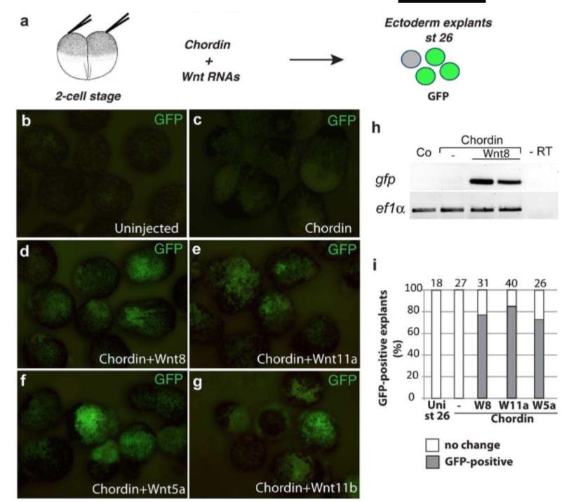 FIGURE 4 Wnt signaling activates sox10:GFP in neuralized ectoderm. a, Experimental scheme for induction of sox10:GFP in neuralized ectoderm. bâg, Ectoderm explants were prepared at st age 10 from Tg(sox10:GFP) embryos injected with chordin RNA (150 pg, c) alone, or in combination with wnt8 (0. 8 ng, d), wnt11a (1 ng, e),wnt5a(1 ng, f), and wnt11b (1 ng, g) RNAs as indicated. The explants were cultured until the equivalent of stage 26 and imaged (b-g) or lysed for RT-PCR (h). h, GFP reporter is activated in transgenic ectoderm explants by chordin and wnt8 RNAs. i, Frequencies of GFP-positive caps (%) . Total number of explants is shown above each bar. |