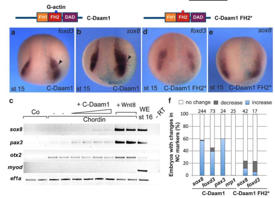FIGURE 7 C-Daam1 with an intact FH2 domain promotes NC specification. C-Daam1 and C-Daam1 F H2 mutant domain structures are shown on the top. a, b, d, e, in situ hybridization of stage 15/16 embryos with indicated antisense RNA probes. Anterior views are shown. Light blue is the lineage tracer (nbGal). Arrowheads point to expanded foxd3 and sox8 in C- Daam1 RNA-injected embryos (10â20 pg, a, b).c, C-Daam1 up regulates NC gene expression in neuralized ectoderm. Ectoderm explants were prepared from embryos injected with C-Daam1 RNA (10â20 pg) or wnt8 RNA (0 .5 ng) and chordin RNA (150 pg) as indicated, cultured to stage 16 and processed for RT-PCR analysis. The explants coexpressing chord in and C-Daam1 upregulate pax-3 and sox8 but do not activate myod.d,e,C-Daam1-FH2* RNA (10â 20pg) does not promote NC gene expression. f, Frequencies of embryos with altered NC marker expression. Total number of explants is shown on top of each bar. |
