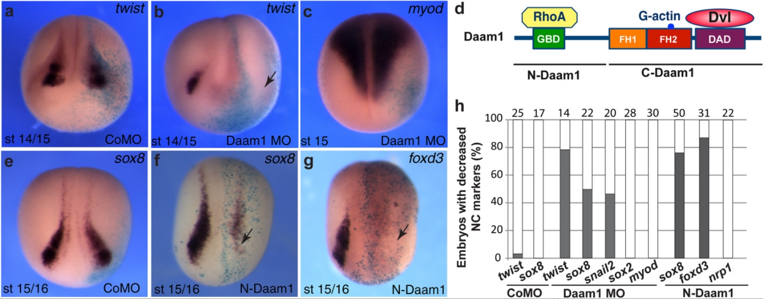 FIGURE 1 Daam1 is required for premigratory NC development. Eight-to-sixteen-cell embryos were unilaterally injected into animal blastomeres with Daam 1 MO (20 ng), control MO (CoMO, 20 ng) or N-Daam1 RNA (10â2 0 pg) as indicated. aâc, eâg, In situ hybridization of stage 14/16 embryos with different antisense RNA probes. The arrows (b, f, g) point to the injected side with inhibited NC marker. Light blue is the lineage tracer (nbGal). Anterior views are shown. NC territory did not change in wild-type (not shown) and CoMO-injected embryos (a, e). d, Daam1 domain structure and interactions are shown. h, Frequencies of embryos with altered NC marker expression. The graphs indicate the percentage of embryos with decreased gene expression. The number of embryos analyzed is shown on top of each bar. |
