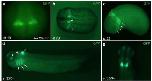 FIGURE 2 Spatial and temporal domains of the sox10:GF P reporter expression during development. GFP reporter expression in Tg(sox10:GFP) embryos at different stages. a, b, stages 19, 23 . White arrowhead in b marks hindbrain expression, the arrow points to migrating NC cells. c, stage 25. Major cranial migratory streams are indicated by arrows, white arrowhead points to the otic vesicle, yellow arrowhead to the hindbrain domain. d, stage 33/34. GFP fluorescence is visible in the otic vesicle (white arrowhead), and three branchial arches (arrows).Yellow arrowheads point to the expression in the eye (a positive control GFP driven by the gamma-crystallin promoter, see Methods) and the hindbrain. (c, d) Lateral view is shown, anterior is to the left. (e) stage 33/34, dorsal view. Strong GFP signal remains in the hindbrain,weaker signals are detected in the forebrain and the otic vesicle. |