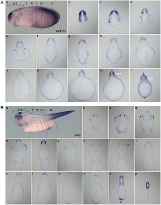 Fig 4. Wnt activity at stages 24–25 and 40. Whole-mount gfp in situ hybridization (Aa, and Ba, lateral views) of Tg(pbin7Lef-dGFP) embryos at stage 24–25 (A) and stage 40 (B). For each stage, transverse sections are shown (Ab-n and Bb-p). The different levels of sections are indicated in panels a. bi: blood islands; ot: otic vesicle. PSM: posterior presomitic mesoderm. |