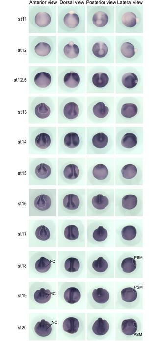 Fig 1.Whole-mount gfp in situ hybridization on Tg(pbin7Lef-dGFP) embryos from stage 11 to stage 20. For each stage, anterior, dorsal, posterior and lateral views are shown. White dotted lines on anterior views delineate the prospective central nervous system during neurulation. NC: migrating neural crest cells, PSM: posterior presomitic mesoderm. |