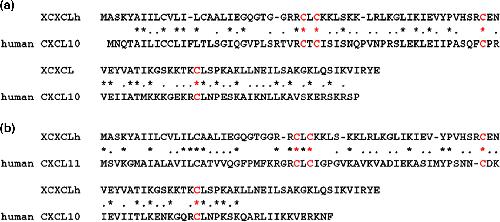 FIGURE 1âAlignment of amino acid sequences of XCXCLh, human CXCL10, and human CXCL11. The conserved amino acids are represented by asterisks (*). Red indicates the CXC- type motif. XCXCLh had a 32.6% and 33.1% sequence homology with human CXCL10 and CXCL11, respectively |