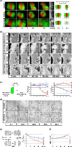 FIGURE4 The role of XCXCLh in chemotaxis. (a) Tissue convergence in three notochord explants. XCXCLh mRNA(500pg/blastomere)orXCXCLh- MO (10 ng/blastomere) with green tracer (EGFP mRNA, 100 pg/blastomere) or red tracer (mCherry mRNA, 100 pg/blastomere) was co- injected into two dorsal blastomeres of 4- cell embryos. Each notochord sector (without epithelium) was dissected from the injected embryos at stage 10. Three notochord sectors were grafted together and cultured on bovine serum albumin (BSA)- coated cover glasses. The elapsed time is indicated at the bottom. The average convergence index for three explants is indicated on the right (n = 3). The far right columns are high magnifications of the last frames (arrowheads). (b) Migration of scattered lateral mesendodermal cells. Lateral mesendodermal cells were dissected and dissociated at stage 10, and placed on fibronectin- coated cover glasses 0.2 to0.5mmfromtheXCXCLh- expressing ventral mesodermal explants or XCXCLh- MO-injected dorsal mesodermal explants. Mesodermal explants were placed on the left side. The elapsed time is indicated at the bottom. (c) Left, schematics of experiments. Right, the ratio of mesendodermal cell migration (n = 10). The ratio of the distance between mesodermal explants and lateral mesendodermal cells was measured every 30 min, and the average ratio is shown by the blue line for the control and red line for the XCXCLh-expressing or XCXCLh- MO- injected explants. (d) The wound healing/scratch assay using MCF- 7 cells. The empty vector (control) or XCXCLh was transfected in MCF- 7 cells, and the confluent monolayer of MCF- 7 cells was scratched with a pipette tip. The elapsed time is indicated at the bottom. (e) Left, schematics of experiments. Right, the ratio of the gap in (d). The gap was measured every 12 hrs, and the average ratio (20 positions) is shown by the blue line for the control and red line for XCXCLh-transfected cells. (f) Growth curves of MCF- 7 cells |