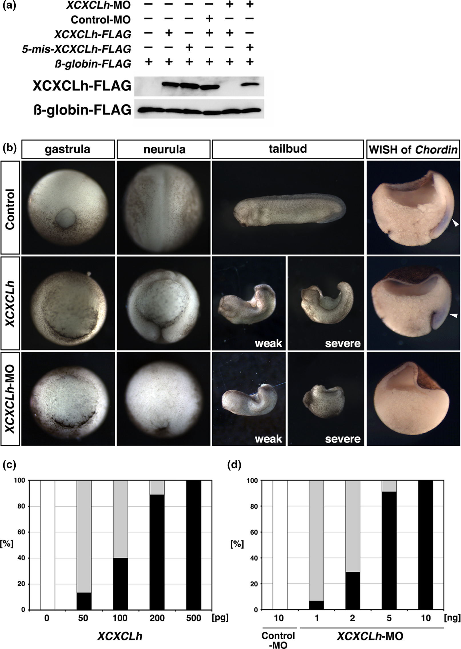 FIGURE3 Phenotypes of XCXCLh- and XCXCLh- MO- injected embryos. (a) The specificity of the antisense morpholino oligonucleotides for XCXCLh. Western blot analysis of the injected embryos at stage 10. XCXCLh- MO inhibited the translation of FLAG- tagged mRNA containingthetargetedsite.ThetranslationoftheFLAG-taggedmRNAcontaining5-mismatchedsequencesatthetargetedsitewasnot inhibited by the XCXCLh- MO. β- globin is used as a loading control. (b) XCXCLhmRNA(500pg/blastomere)orXCXCLh- MO (10 ng/blastomere) was injected into the marginal region of two dorsal blastomeres of 4- cell embryos. Gastrula, stage 12 (vegetal view). Neurula, stage 16 (dorsal view). Tailbud, stage 30 (lateral view); left, weak phenotypes; right, severe phenotypes). WISH of Chordin, whole mount in situ hybridization of bisected embryos (stage 11) with using Chordin probes. Arrowheads indicate expression of Chordin. (c, d) Effects on phenotype by increasing doses of XCXCLh (c) and XCXCLh-MO(d).Theratioofeachphenotypeintheinjectedembryos(45embryos/bar)was indicated in the graph. Black bars represent ratio of severe phenotypes as shown in B, right panels. Gray bars represent ratio of weak phenotypes as shown in B, left panels. White bars represent normal embryos |