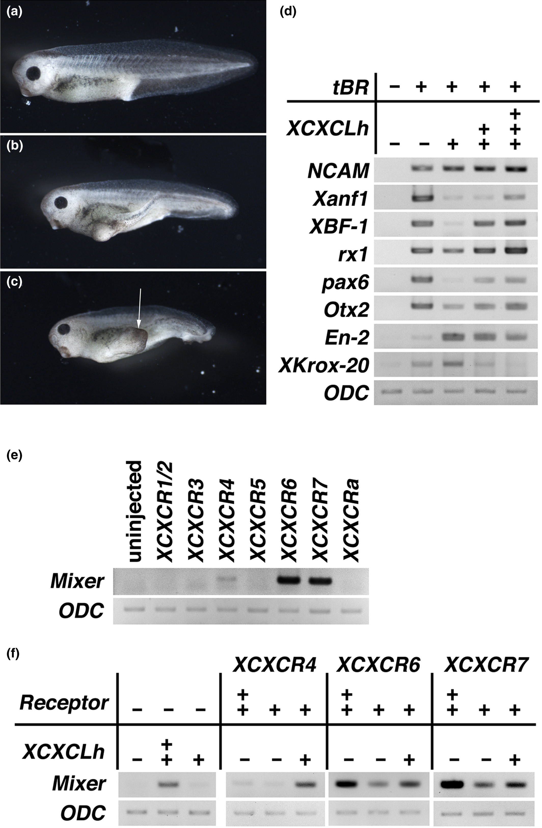 FIGURE6 Effects of XCXCLh on the anterior- posterior axis formation. (a–c) Phenotypes of tBR and XCXCLh co- injected embryos. (A) Control, stage 40 embryo. (b) The tBRmRNA(500pg/blastomere) was injected into the ventral blastomeres of 4- cell embryos. (c) The tBR (500pg/blastomere)andXCXCLh(500pg/blastomere) mRNAs were co- injected. (d) RT- PCR analysis of animal caps at the neurula stage (stage 16). The tBR(500pg/blastomere) and different dose of XCXCLh (+,125pg;++,250pg;+++,500pg/blastomere) mRNAs were co- injected into the animal blastomeres of 8- cell embryos. Total RNA was extracted from the animal caps (stage 16). (e) RT- PCR analysis of animal caps at the gastrula stage (stage 10). The indicated Xenopus CXC- type receptormRNAs(500pg/blastomere)were injected into the animal blastomeres of 8- cell embryos. Total RNA was extracted at stage 10. (f) The different dose of XCXCLh(+,125pg;++,250pg;pg/blastomere) mRNAs were co- injected with indicated Xenopus CXC- type receptor (+,125pg;++,250pg;pg/blastomere)mRNAs into the animal blastomeres of 8- cell embryos. Total RNA was extracted at stage 10 |