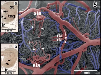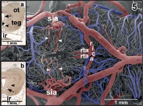 Figure 5. Same as Figure 4 but after removal of vascular beds of infundibular region (ventral hypothalamus) and hypophysis. Note the deeply penetrating branches of the superficial infundibular arteries (sia; arrowheads), the retroinfundibular communicating artery (rica) and the origin of prominent ascending rostral tegmental arteries (rta). Inset a. Histomorphology of (right) optic tectum (ot) and tegmentum (teg) of the mesencephalon. Paraplast embedded Goldner stained tissue section (7 µm). Transverse section at the level of the ascending rostral tegmental arteries (arrowheads). Arrow marks the mesencephalic ventricle. ir, infundibular recess. Inset b. Same as inset a, but slightly more caudal section. Note the horizontally running caudal branch of the (right) rostral tegmental artery (arrow) and its ascending branch (arrowhead) |