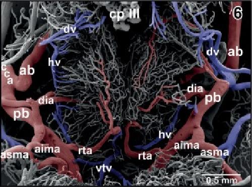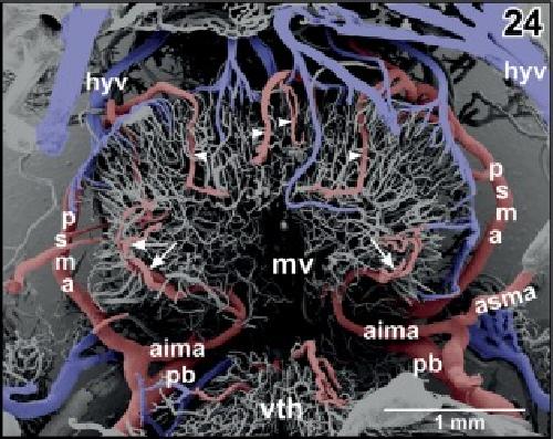 Figure 24. Arterial supply and venous drainage of the mesencephalon (parts of the rostral optic tecta are removed). Anterior is at bottom. Note the prominent anterior inferior mesencephalic arteries (aima) which first penetrate deeply into subependymal areas and then curve in a semicircular manner (arrows). Branches from the posterior superior mesencephalic arteries (psma) radiate from caudally deep into the optic tecta (arrowheads) |