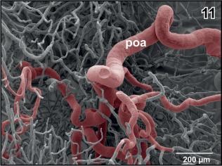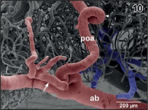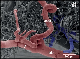 Figure 10. Origin of the preoptic artery (poa) from the anterior branch of the cerebral carotid artery (ab). Note the coiling of the artery (arrowhead) and the sideâbranch of the artery (arrow) |