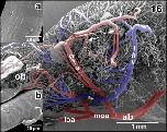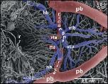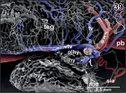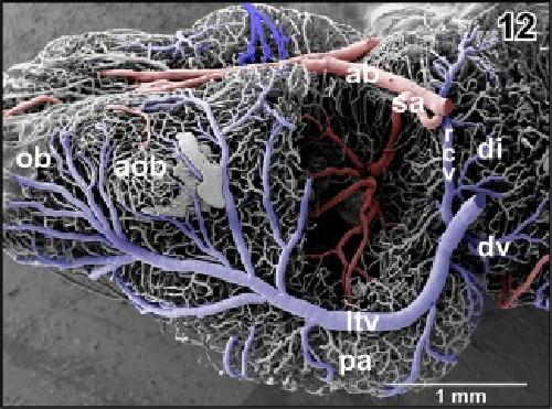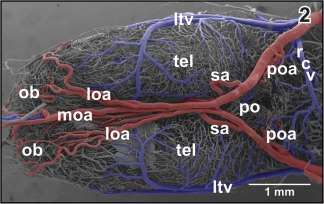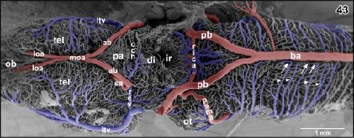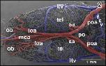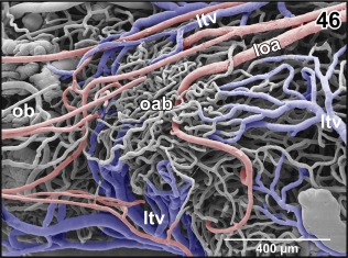 Figure 46. Microvascular anatomy of the accessory olfactory bulb (aob). Ventroâlateral view. Note the dense capillary bed supplied by a branch of the lateral olfactory artery (loa) and the drainage by ventral, lateral, and dorsal branches of the lateral telencephalic vein (ltv) |