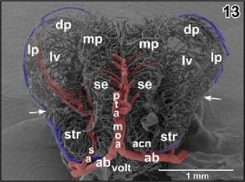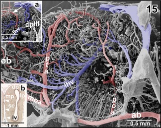 Figure 16. Obliquely ascending posterior telencephalic artery (pta) giving off a rostrally directed branch at the level of the dorsomedial pallium (arrowhead). The main trunk bends toward caudal and issues several branches (arrows). Inset a. Characteristic endothelial cell nuclei imprints (arrowheads) at the surface of a cast artery (posterior telencephalic artery). Imprints are longish and orientate parallel to the vessel axis. Inset b. Characteristic endothelial cell nuclei imprints (arrowheads) at the surface of a cast vein (interhemispheric vein). Imprints are oval to roundish and orientate randomly |