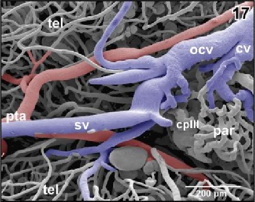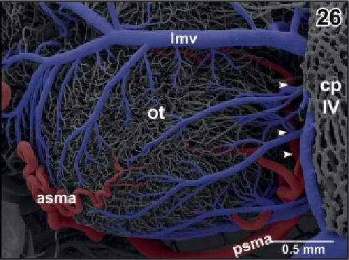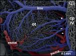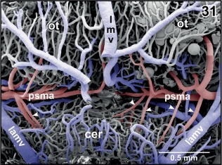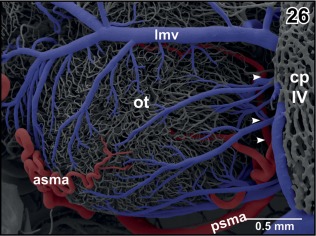 Figure 26. Arterial supply and venous drainage of the left optic tectum. Rostral is to the left. Note the transverse course of the posterior superior mesencephalic artery (psma; arrowheads) within the cleft between optic tectum (ot) and cerebellum (hidden by the overlying choroid plexus of the fourth ventricle (cp IV) |