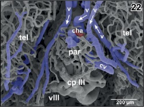 Figure 22. Vascular patterns of paraphysis (par) and choroid plexus of the third ventricle (cp III). Dorsal aspect. Note the veins (v) draining medial pallial areas into the choroid plexus. Arrows indicate proposed direction of blood flow |