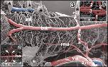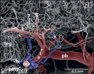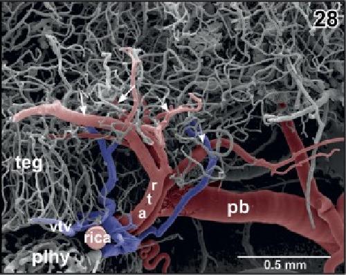 Figure 28. Origin of the rostral tegmental arteries (rta) from the retroinfundibular communicating artery (rica). Lateral view. Note the bifurcations of the arteries into anteriorly (small arrows) and posteriorly directed branches (large arrows) |