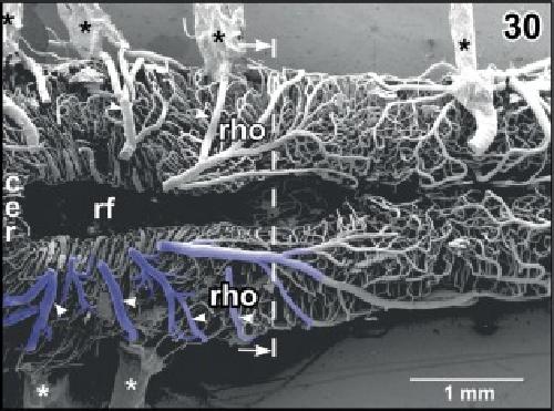 Figure 30. Microvascular anatomy of the cerebellar (cer)ârhombencephalic (rho) area. Dorsal view. Choroid plexus of the fourth ventricle is removed to expose the rhombencephalic fossa (rf). Note the circumferentially running tegmental veins (arrowheads) which drain into the choroid plexus of the fourth ventricle. Asterisks mark conductive bridges |