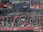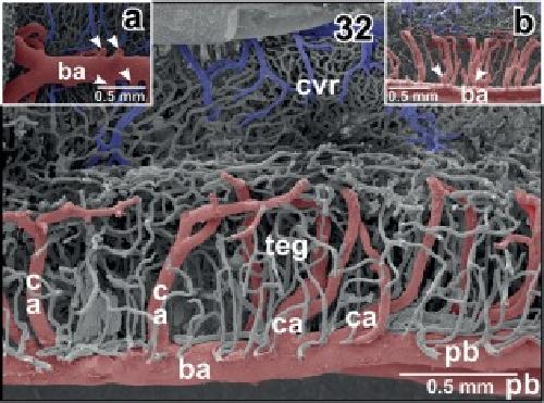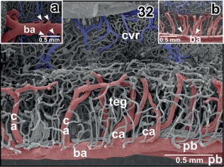 Figure 32. Vascular architecture of the rhombencephalic tegmentum (teg) and cochlearâvestibular nuclear regions (cvr). Slightly parasaggitally sectioned rhombencephalon. Rostral is to the right. Note origin, course and branching patterns of central arteries (ca). Inset a. Central arteries (arrowheads) branching off the lateral circumference of the basilar artery (ba). Inset b. Central arteries branching immediately after their origin from the basilar artery (arrowheads) |