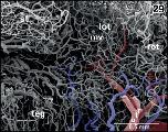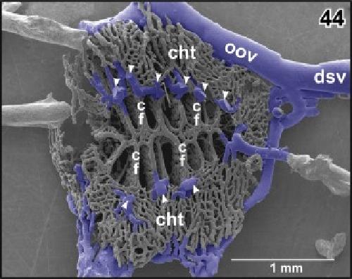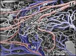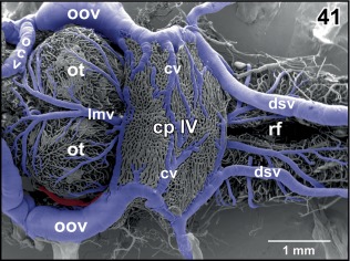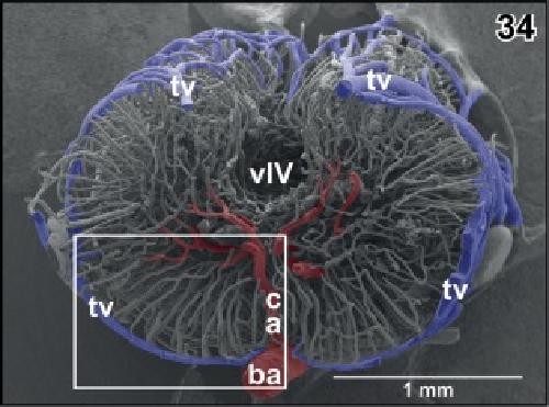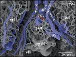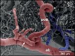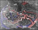 Figure 45. Detail from Figure 44. Vertical, transversely orientated choroidal folds (cf) made up from a dense 2D network of sinusoids. Choroidal folds reveal ventral venules (vv) which interconnect at the midline. Note the many sites of ongoing intussusceptive angiogenesis (arrows) |