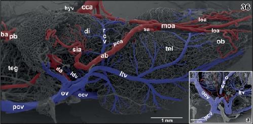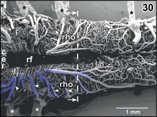 Figure 8. Internal microvascular anatomy of the brain of adult X. laevis. Sagittally sectioned vascular corrosion cast. Right half of the brain displaying telencephalon (tel), diencephalon (di) (without hypothalamus and hypophysis), mesencephalon (mes), cerebellum (cer), and rhombencephalon (rho). Asterisks mark conductive bridges |