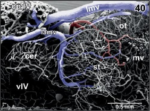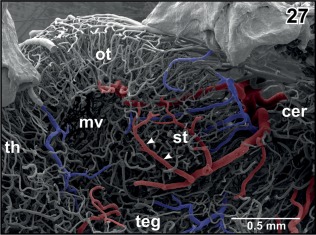 Figure 27. Arterial supply and venous drainage of the semicircular torus (st). Note the location of the innermost arteriole (arrowheads) close beneath the subependymal capillary bed and the radial arrangement of tectal vessels |