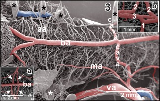Figure 3. Anatomy of the vertebroâbasilar arterial system. Inset a. Communicating arteries (arrows) bifurcate before they join the basilar artery (ba) bilaterally. Inset b. Asymmetric junctions of left (1) and right (2) communicating arteries with the basilar artery (3). Asterisks mark conductive bridges |