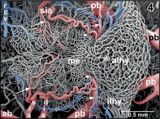 Figure 4. Microvascular anatomy of the ventral hypothalamoâhypophysial region. Ventral aspect. Note the superficial infundibular artery (sia) which gives off a medially directed branch (large arrows) supplying the delicate capillary network of the retrochiasmatic (rostral) and infundibular (caudal) region. The parent artery bends toward caudal to supply the median eminence (me) via a medially directed branch (arrowheads) and the intermediate lobe of the hypophysis (ilhy) via a laterally directed terminal branch (small arrows) |