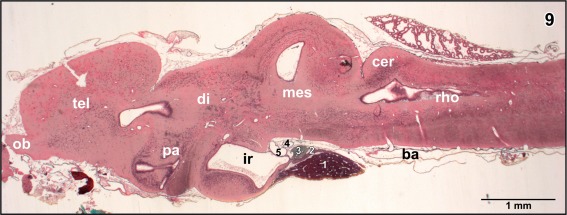 Figure 9. Histomorphology of the brain of adult X. laevis. Paraplast embedding. Goldner stained sagittal section (7 µm) at a similar level as displayed in Figure 8. (1) anterior lobe of hypophysis, (2) intermediate lobe of hypophysis, (3) posterior lobe of hypophysis, (4) retroinfundibular communicating artery, and (5) encephaloâposthypophysial portal vein |