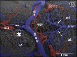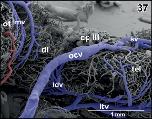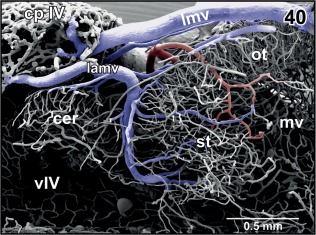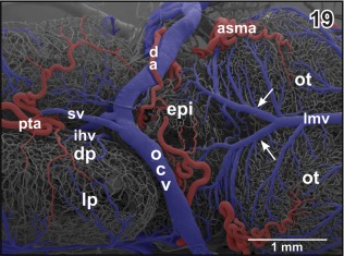 Figure 19. Microvascular anatomy of caudal dorsal (dp) and lateral pallium (lp), epithalamus (epi) and optic tectum (ot). Dorsoâlateral view. Note the prominent oblique cranial vein (ocv) and the medially located longitudinal mesencephalic vein (lmv) which by two tributaries (arrows) drains epithalamic, thalamic and rostral, and lateral areas of the optic tecta |