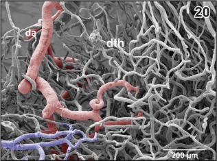 Figure 20. Branch of the diencephalic artery (da) within the (right) dorsal thalamus (dth) after removal of subependymal vessels. Ventricular view. Rostral is to the left |