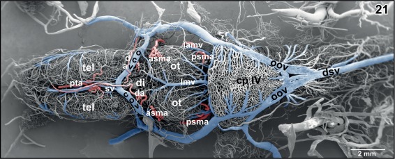 Figure 21. Microvascular anatomy of the brain of adult X. laevis. Dorsal view. Note the dorsal location of cranial veins |