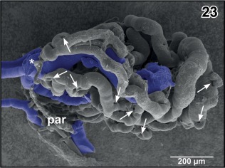 Figure 23. Isolated choroid plexus of the third ventricle. Same specimen as in Figure 22, but ventroâlateral aspect. The interhemispheric vein (asterisk) continues as wide sinusoid within the plexus. Note the many sites of ongoing intussusceptive microvascular growth (arrows) |