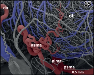 Figure 25. Origin and course of anterior superior mesencephalic artery (asma). Note the coiling of the artery at the rostrolateral area of the optic tectum (ot). Rostral is to the left |
