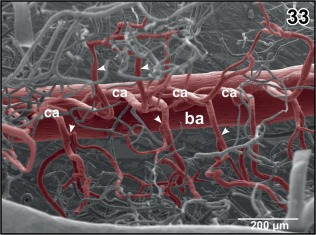 Figure 33. Branching patterns of central arteries. Dorsal view at bifurcating central arteries (ca) after removal of subependymal vessels. Note branches to right or left tegmental areas (arrowheads) |