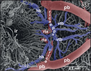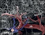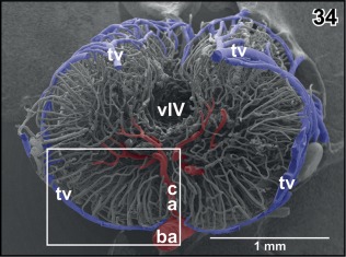 Figure 35. Radial arrangement of rhombencephalic tegmental capillaries (c). Detail from Figure 34 (box). Specimen slightly tilted. Note H‐shaped (arrowhead) and Y‐shaped (arrows) branchings |