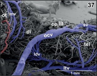 Figure 37. Course and caliber of the (right) oblique cranial vein (ocv). Lateral view at the optic tectum (ot), diencephalon (di), and caudal telencephalon (tel). Rostral is to the right |