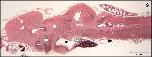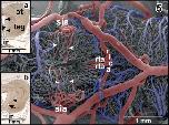 Figure 15. Origin, course, and areas of supply of the posterior telencephalic artery (pta). Inset a. Terminal portion of the posterior telencephalic artery (arrow). Inset b. Histomorphology of the right telencephalic hemisphere. Transverse section (7 µm). Goldner staining. Note the ascending posterior telencephalic artery (arrowheads) |