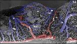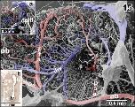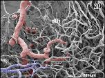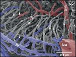 Figure 1. Microvascular anatomy of the brain in adult X. laevis. Vascular corrosion cast. SEM. Ventral view displaying telencephalic hemispheres (tel), preoptic area (pa), hypothalamus (hyp), hypophysis (hy), and mesencephalic and rhombencephalic tegmentum (teg). Arterial vessels are red, venous vessels are blue, and meningeal vessels are green. Asterisks mark extravasates. For further abbreviations in this and following figures see the list of abbreviations |