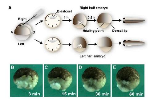 Bisection leaves a large wound that heals by tissue movements from all directions, closing the gap within 1 h, and leaving only a small healing point where the dorsal and ventral-most cells become juxtaposed. Dorsal lip formation starts 3.5 h later and pigment asymmetry can be observed 1 d later in the epidermis of tailbud tadpoles.