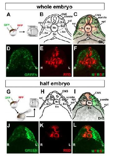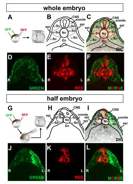 L) Section of a right-side half embryo showing that tissues in the dorsal midline