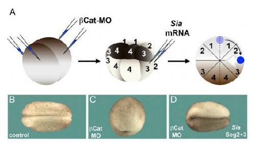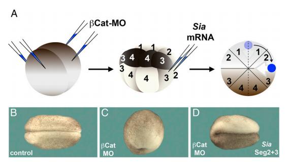 axial structures due to loss of Spemann’s organizer (n = 50). (D) Embryo injected with βCat MO and rescued by injection of Siamois mRNA into the vegetal tier of