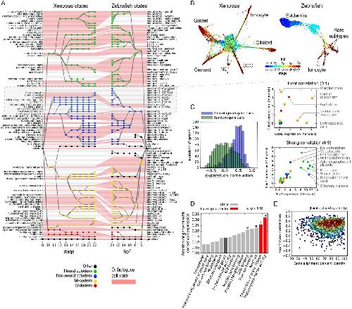 Fig. 4 Similarities and differences in developmental cell state hierarchies and gene expression between frog and fish.